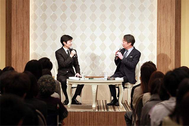さらに、もうじき50歳になることに「全然、ピンと来ないんです。子供の頃に50歳っていうと、もの凄くおじさんというか、初老だと思っていたんですよね。それにしても見栄晴さんは老けていますね。僕と2歳しか違わないのに(笑)。僕は30代半ばからはあまり変わってないと思いますよ。でも髪の毛は付けているんです。嘘です(笑)。」と序盤から絶妙なトークで会場を大いに盛り上げていました。