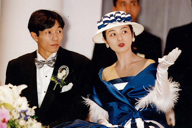 「結婚式の写真です。平成7年なので23年前になります。1000勝パーティーを兼ねての披露宴でした。この時に野茂英雄さんも来て下さって、野茂さんが入って来たら皆がこちらに背を向けて、一斉に野茂さんの写真を撮っていましたよ(笑)。丁度、野茂さんがメジャーに行かれた年で、オフに日本へ帰って来て初めての公の場だったんです。
